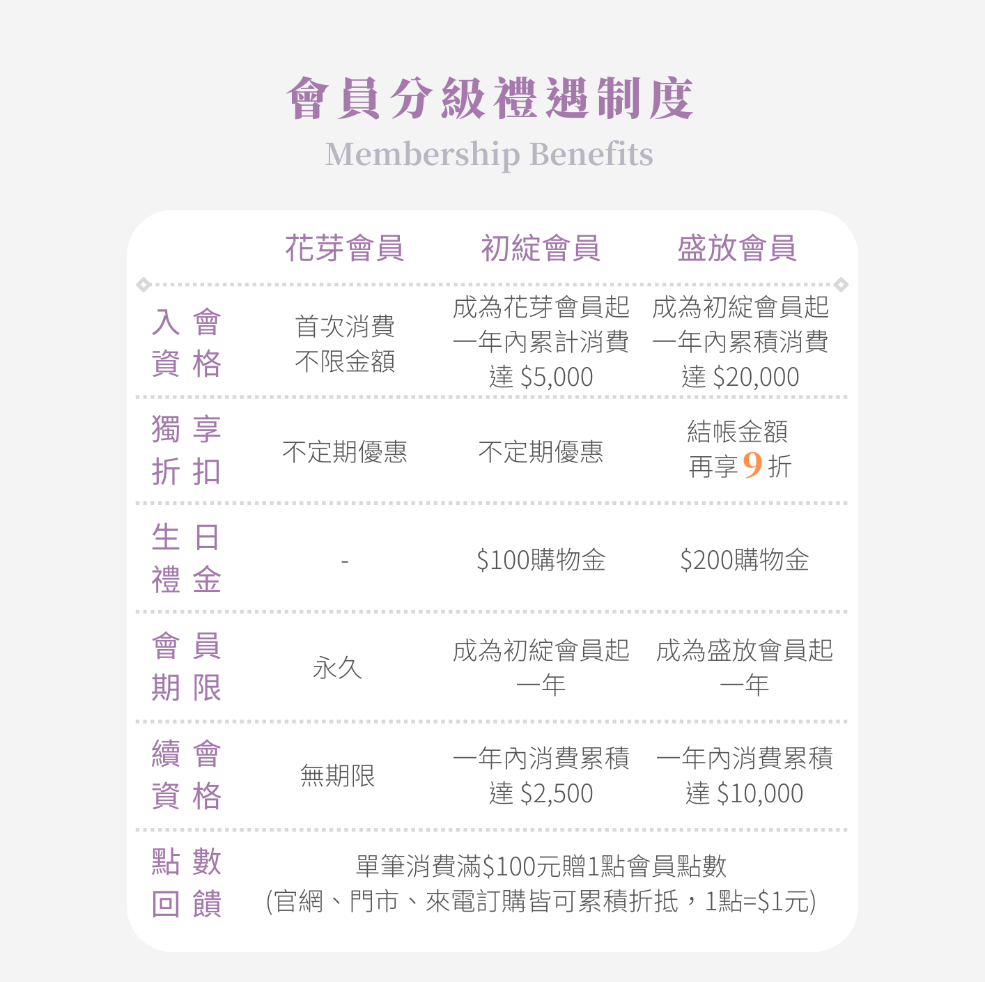 ♡ 盛放會員結帳金額再享9折優惠,花芽會員、初綻會員可享不定期優惠。
