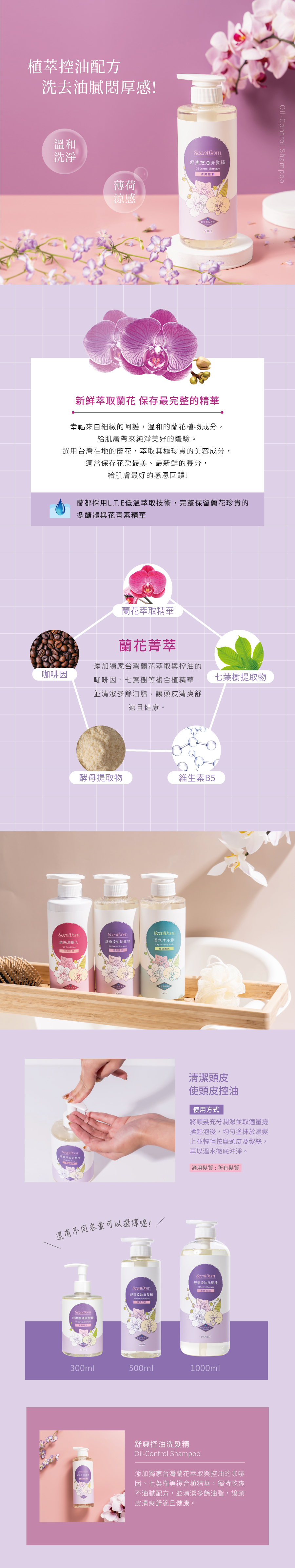 添加獨家台灣蘭花萃取與控油的咖啡因、七葉樹等複合植精華,獨特乾爽不油膩配方,並清潔多餘油脂,讓頭皮清爽舒適且健康。