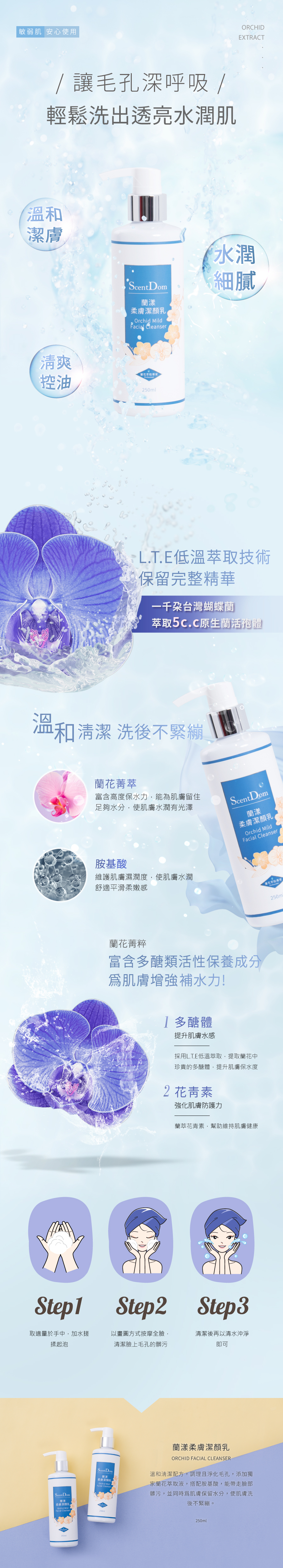 溫和清潔配方,調理且淨化毛孔,添加獨家蘭花萃取液,搭配胺基酸,能帶走臉部髒污,並同時為肌膚保留水分,使肌膚洗後不緊繃。