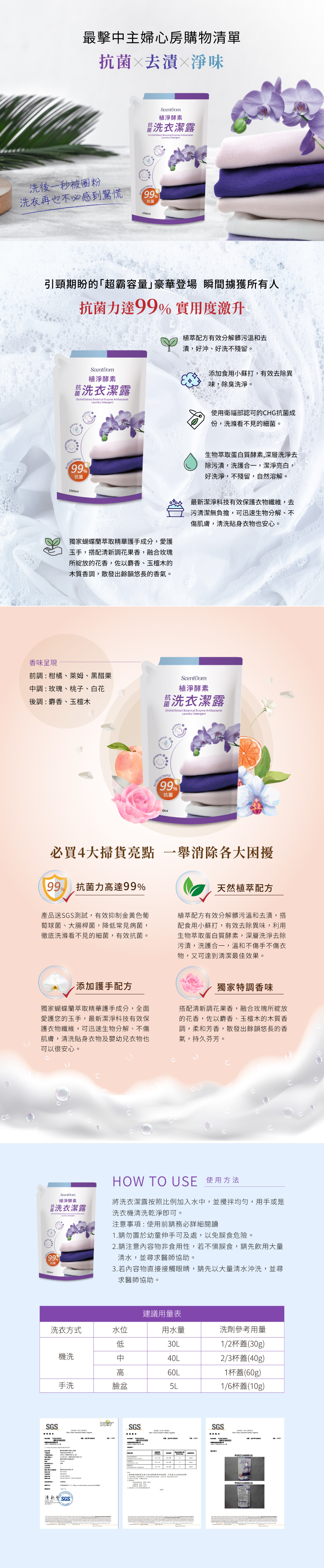 ✓植萃配方有效分解衣物上的污漬,溫和洗淨衣物。
